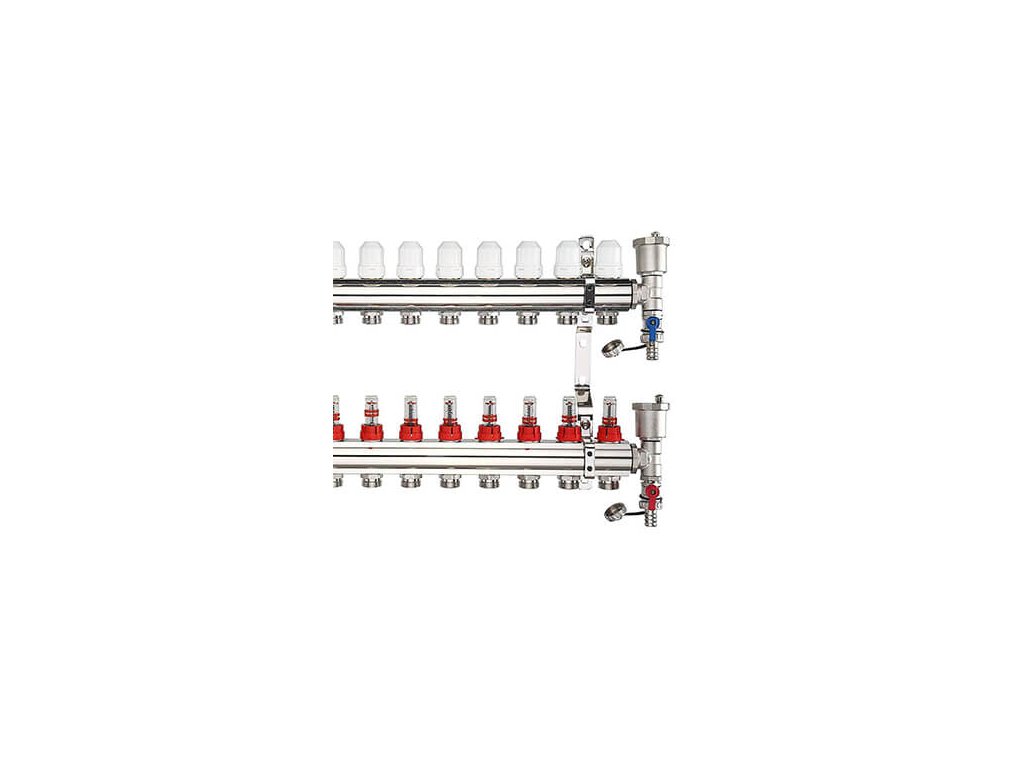 Nerezový rozdělovač s průtokoměry - 10 okruhů (2x automatický odvzdušňovací a 2x vypouštěcí ventil)