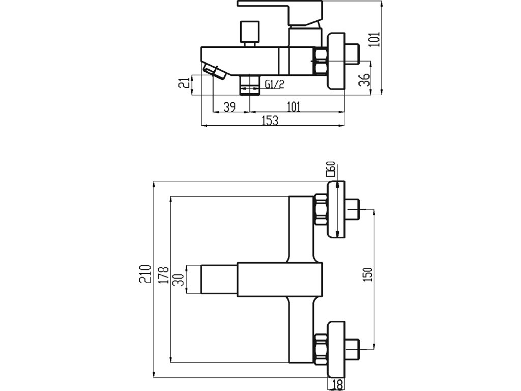 Prvotřídní chromovaný povrch. Nástěnná vanová baterie s roztečí 150 mm a kovovým uzamykacím spínačem.