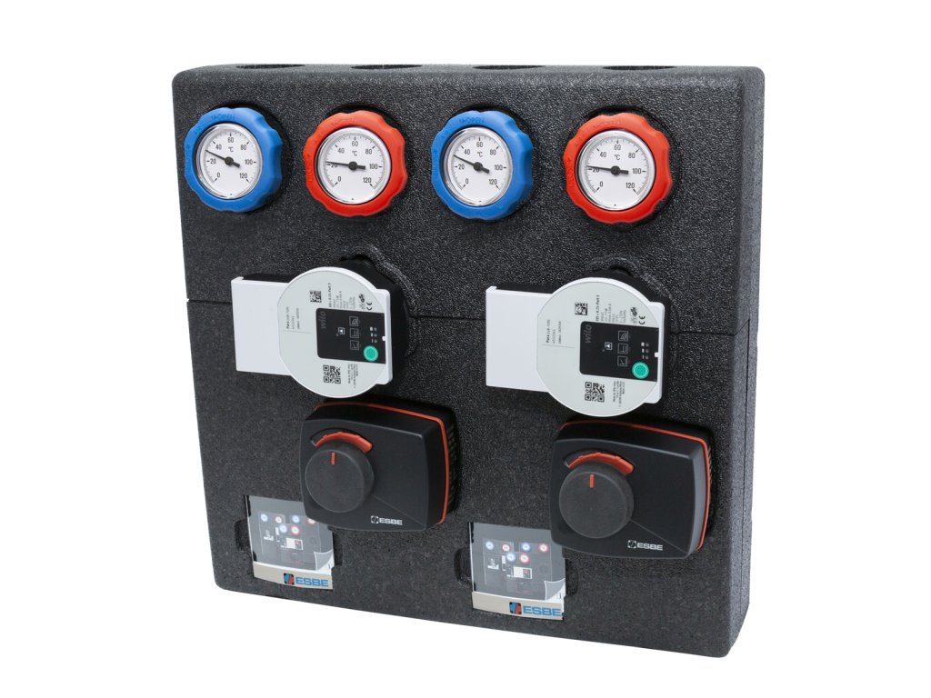 - Dvojitá regulácia: Obe vetvy sú vybavené zmiešavacím ventilom ESBE VRG430 a 3-bodovým servopohonom ARA661 (230 V) pre maximálnu kontrolu.