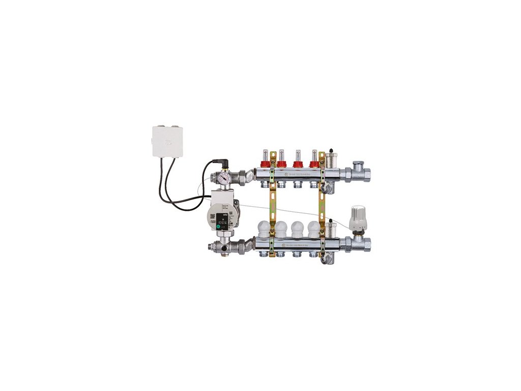 Konštrukcia obsahuje obehové čerpadlo, rozdeľovače s regulátormi prietoku, termostatické ventily a kontrolné meracie prístroje (teplomery). Pre zabezpečenie prevádzkovej bezpečnosti je zostava vybavená havarijným termostatom. V prípade prekročenia teploty 55 °C dôjde k automatickému odstaveniu čerpadla, čím sa eliminuje riziko tepelného poškodenia podlahových vrstiev. Po poklese teploty pod stanovenú hranicu sa systém automaticky vráti do prevádzky.