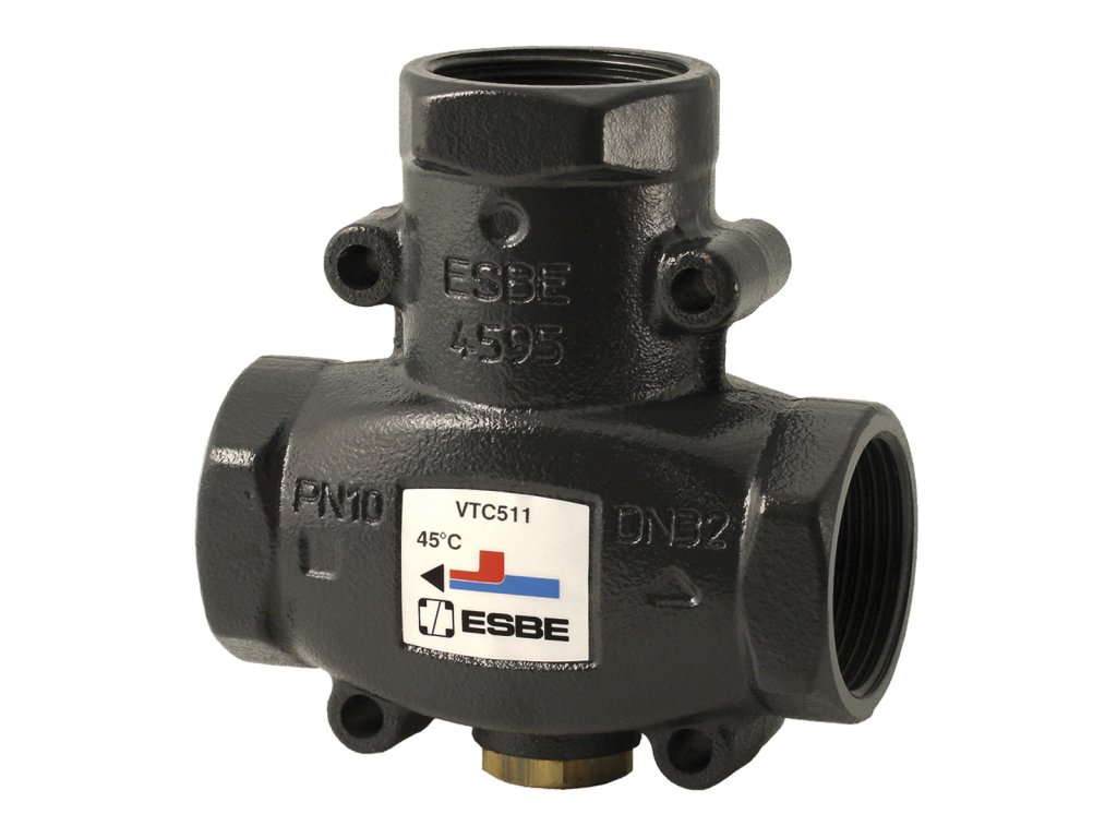 Termostatický ventil ESBE VTC 511-25/50 je vysokoúčinný plniaci ventil navrhnutý na ochranu kotlov na tuhé palivá do výkonu 150 kW pred nízkoteplotnou koróziou a dechtovaním. Zabezpečuje udržiavanie stabilne vysokej teploty spiatočky, čím výrazne predlžuje životnosť kotla a zvyšuje jeho celkovú účinnosť. Ventil je možné použiť ako rozdeľovací alebo zmiešavací.