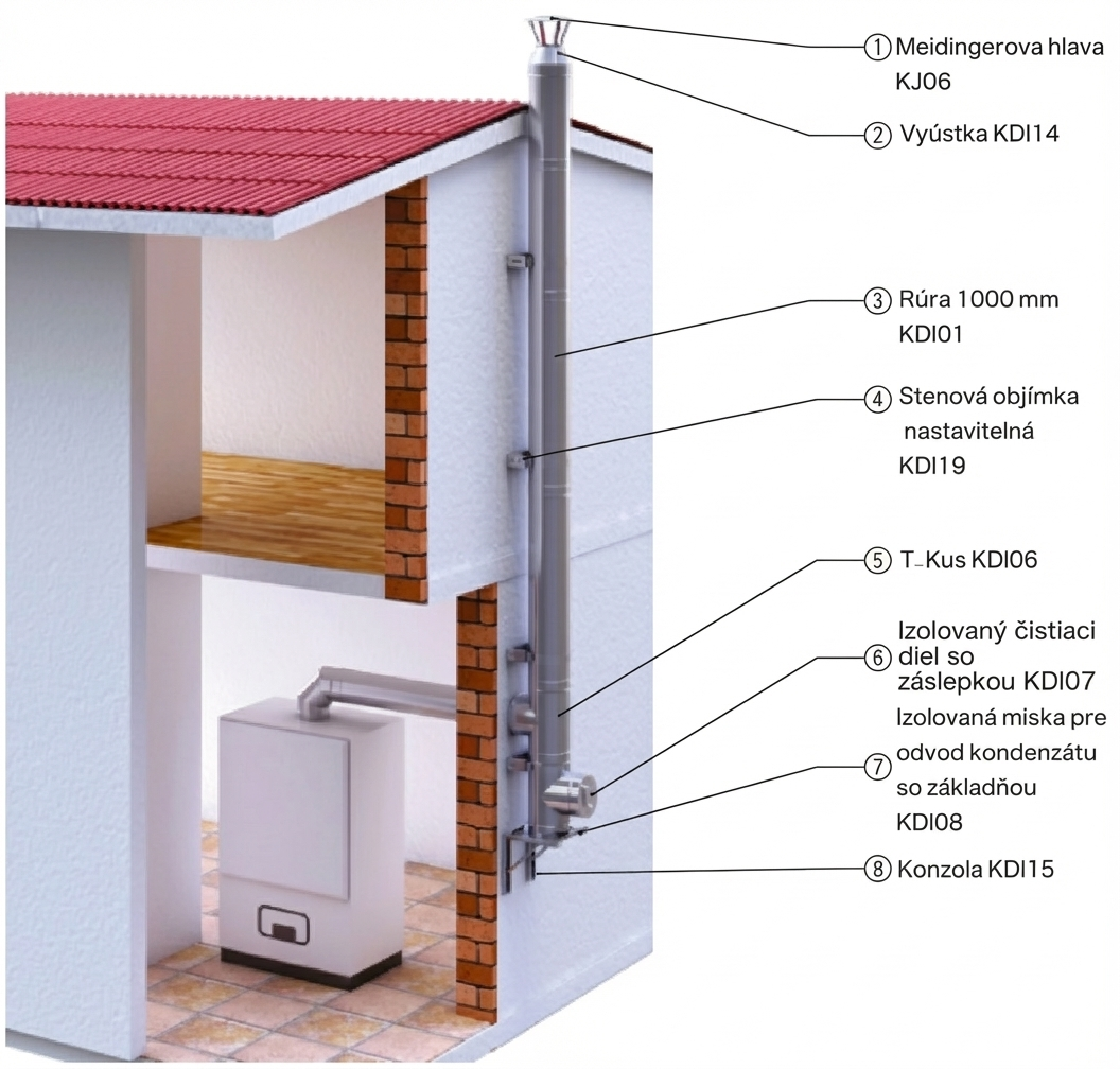 Konštrukcia je vyrobená z kvalitnej nerezovej ocele s hrúbkou steny 0,6 mm, ktorá zabezpečuje vysokú odolnosť voči korózii, vysokým teplotám a agresívnemu kondenzátu. Trojplášťové izolované prevedenie minimalizuje tepelné straty, znižuje povrchovú teplotu vonkajšieho plášťa a zvyšuje celkovú bezpečnosť prevádzky.