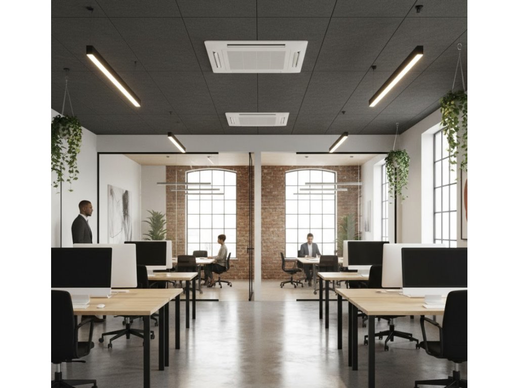 Vnútorná kazetová jednotka Midea s rámčekom je určená na inštaláciu do podhľadu a zabezpečuje rovnomerné 4-smerné prúdenie vzduchu v celej miestnosti. Ponúka ideálne riešenie pre obchodné priestory a kancelárie, kde je požadovaný diskrétny vzhľad a zároveň vysoký výkon.